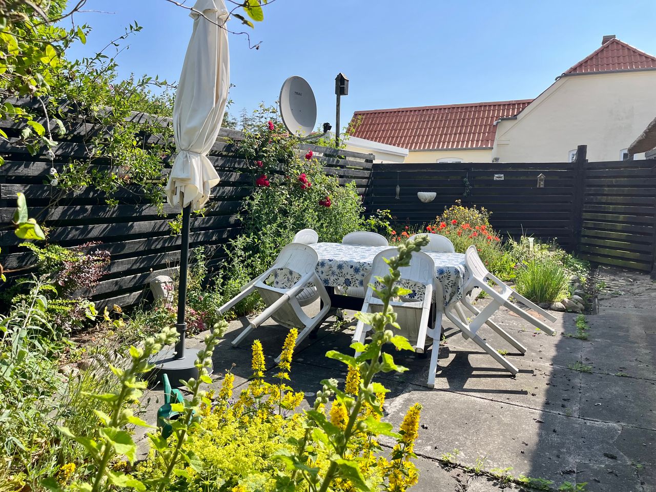 Fra baggangen er der udgang til en hyggelig, flisebelagt gårdhave.